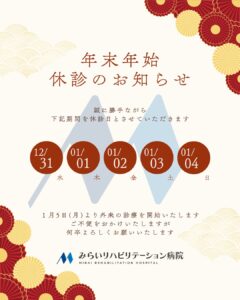 年末年始休診のお知らせです。 12/31(水)~1/4(日)まで休診日とさせていただきます。 1/5(月)より外来の診療を開始いたします。